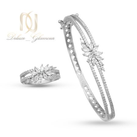 ست دستبند و انگشتر نقره طلایی ns-n692 دارای دستبند به صورت طرح فلاور است که نگین های درخشان و زیبای زیرکونیا بر روی آن قرار گرفته شده است همچنین این دستبند دارای قفل کراواتی است که این امکان را فراهم می کند دستبند فری سایز باشد و بتوان آن را متاسب با هر سایز مچ دستی تطبیق داد. انگشتر این ست زیبا نیز به صورت حلقه پرنس می باشد که نگین های باگت آن نیز از نوع زیرکونیا است و در سایز های مختلف در فروشگاه لوکس گلامور موجود است از همین رو می توانید قبل از خرید اقدام به تعیین سایز انگشتر نمایید.