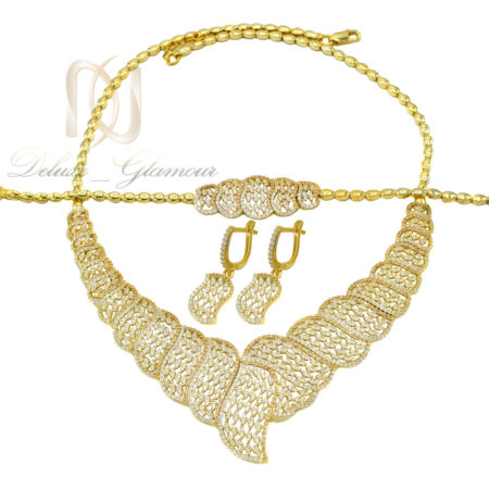 سرویس عروس نقره طرح جواهری ns-n257 متشکل از سینه ریز ، دستبند و گوشواره است. این سرویس زیبا از جنس فلز نقره با عیار 925 ساخته شده است و به دلیل کیفیت بالای نقره آن بدون تغییر رنگ است و در مقابل رطوبت و زنگ زدگی به شدت مقاوم است. این سرویس عروس دارای روکش آب طلای سفید است و به همین جهت کاملا مشابه طلا می باشد و میتواند جایگزین مناسبی طلا سفید باشد.
