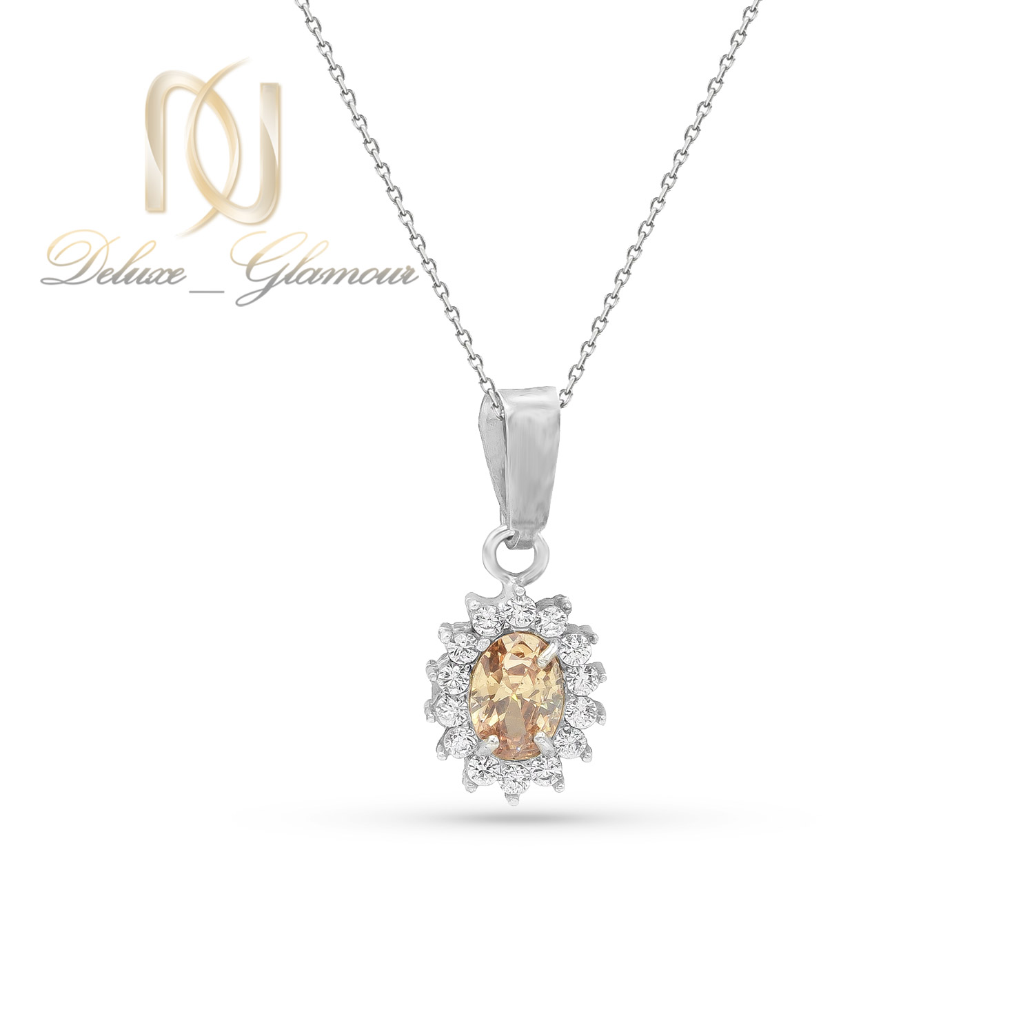 گردنبند نقره زنانه ظریف با سنگ زیرکونیا شامپاینی ne-n168 یک طرح جدید و فوق العاده درخشان از سری آویز و زنجیر های زنانه می باشد که از نقره عیار 925 ساخته شده و بدون کوچکترین تغییر رنگ و افت کیفیتی می باشد. این گردنبند زنانه به صورت سنگ دار ساخته شده و بر روی آن نگین و سنگ های درخشان از نوع زیرکونیا کار شده اند که ترکیبی از رنگ های سفید و شامپاینی میباشند.