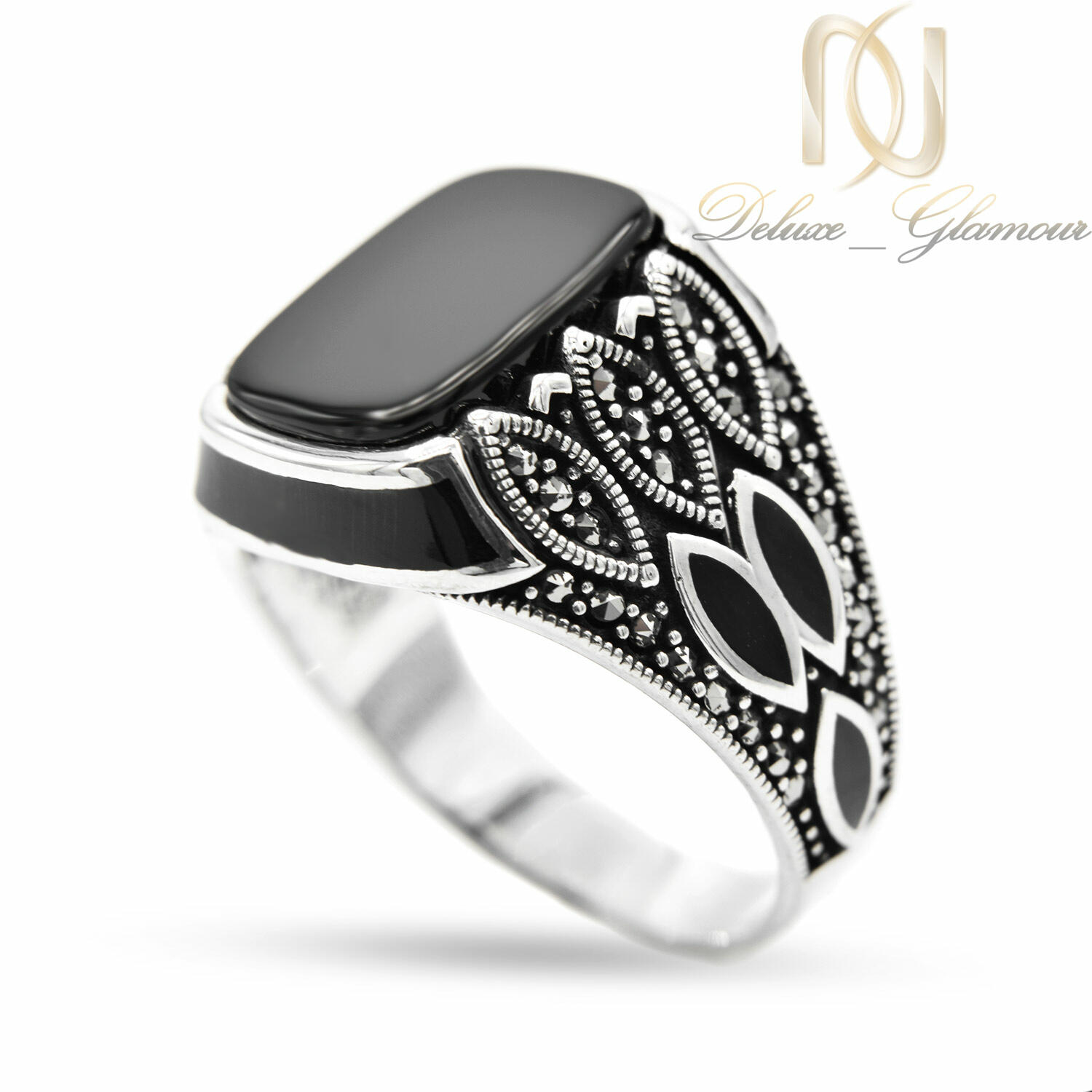 انگشتر مردانه نقره ترک طرح برگ rg-n902 دارای رکابی خاص و زیبا به صورت طرح برگ است که بر روی آن سیاه قلم کاری شده که باعث ایجاد تم مشکی بر روی انگشتر شده است. لازم به ذکر است که بر روی این انگشتر زیبا نگین های مارکازیت اتریشی نیز وجود دارد که بدون ریزش هستند و درخشش بالایی دارند. نگین این انگشتر مردانه خاص نیز به صورت مربعی و دارای ابعاد 15*10 میلی متر است که از جنس اونیکس و به صورت طرح عقیق است.