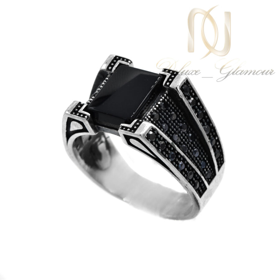 نگین اصلی این انگشتر از سنگ طبیعی اونیکس (لونیکس) ساخته شده که با درخشش عمیق و رنگ مشکی خاص خود، جلوه ای مردانه دارد. در کناره ها نیز سنگ های مارکازیت ظریف کار شده اند که تضاد زیبایی با رنگ تیره اونیکس ایجاد می کنند