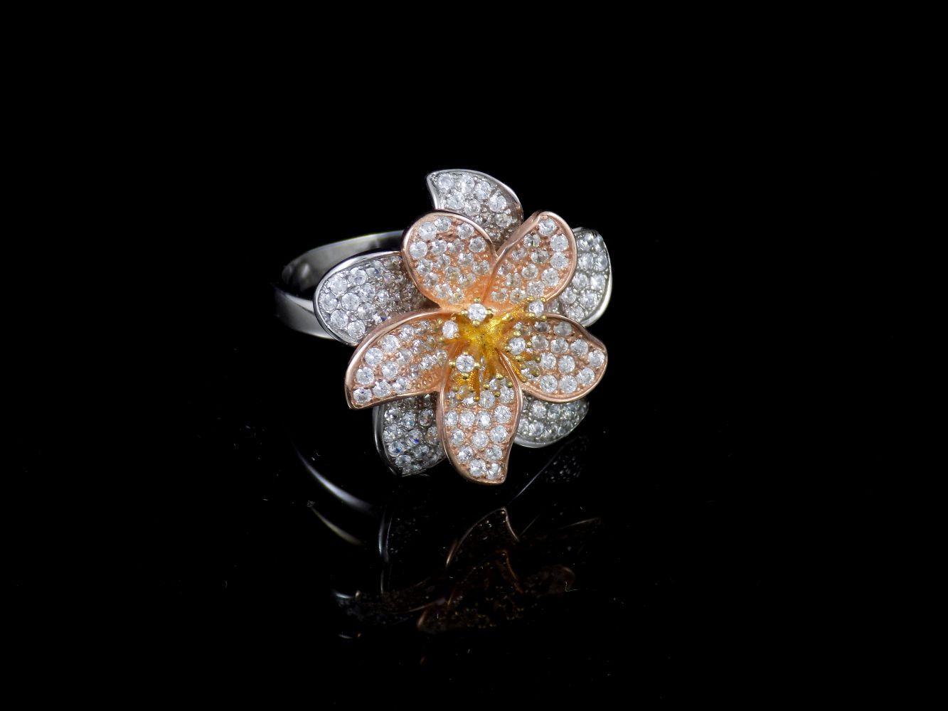 انگشتر نقره زنانه طرح گل 7.10 گرمی نگین زیرکونیا DL-A101 از سری زیورآلات نقره است که دارای عیار 925 است و بدون تغییر رنگ می باشد. این انگشتر ه صورت طرح گل می باشد و سه رنگ در ساخت آن به کار رفته است که رنگ نقره ای گلبرگ های خارجی و تم اصلی انگشتر را تشکیل می دهد و گلبرگ های داخلی به رنگ رزگلد است که زیبایی بی نظیری به انگشتر بخشیده است. نگین های به کار رفته در انگشتر نیز از جنس زیرکونیا است و به صورت باگت هستند و بدون ریزش می باشند.