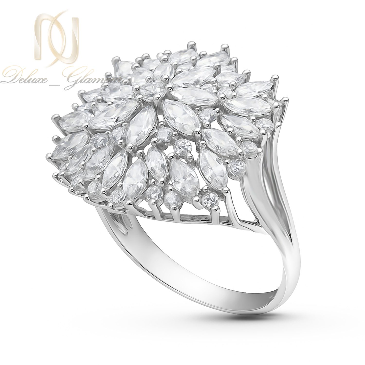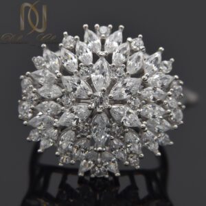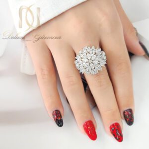 انگشتر نقره زنانه مجلسی ri-n327 از نقره عیار ۹۲۵ ساخته شده و با آبکاری رودیوم پنج لایه پوشانده شده است. این نوع آبکاری باعث می شود رنگ آن در طول زمان تغییر نکند و درخشش خود را حفظ کند. طراحی این انگشتر ترکیبی از ظرافت و استحکام است و نگین های سفید زیرکونیا مارکیز به زیبایی روی آن کار شده اند.