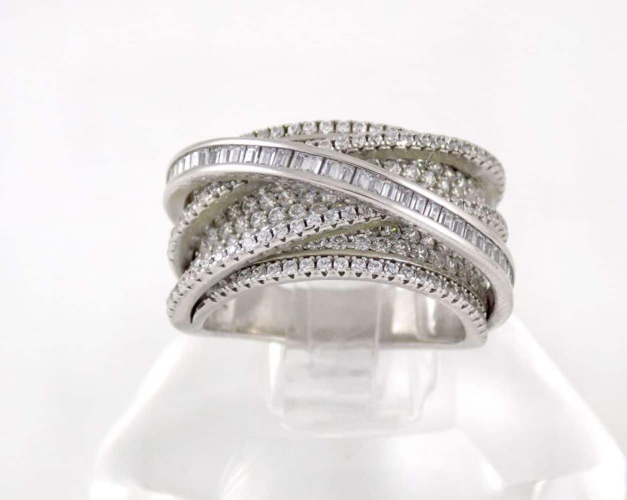 انگشتر نقره زنانه 8.65 گرمی با نگین های زیرکونیا سفید رنگ DL-A103 از سری زیورآلات زنانه است که از فلز نقره ساخته شده است و بدون تغییر رنگ می باشد. این انگشتر ایتالیایی است و دارای کیفیتی بالایی است. این انگشتر رج دار است و بر روی آن نگین های کریستالی سفیدی قرار گرفته اند که به صورت باگت هستند و ریزش ندارند. همچنین در ساخت این انگشتر نیکل به کار نرفته است و از همین رو با پوست های حساس سازگار است و بر روی آن ایجاد حساسیت نمی کند.