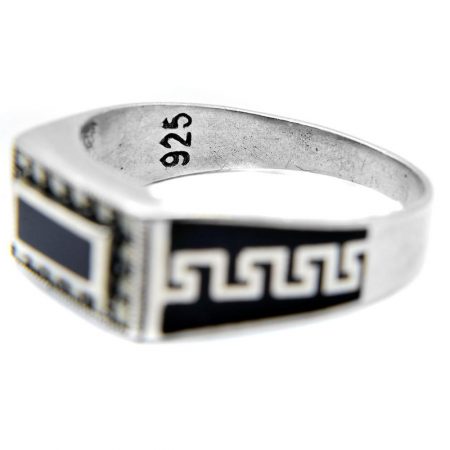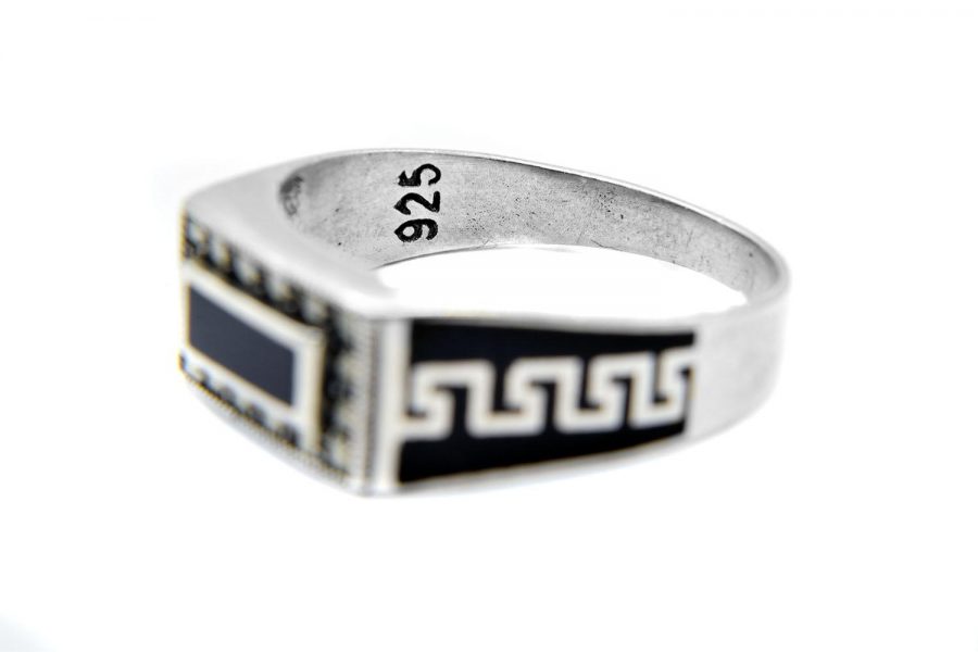 آبکاری انجام گرفته بر روی این انگشتر نیز از نوع رودیوم می باشد؛ این روکش یکی از عواملی است که باعث می شود انگشتر بر روی پوست ایجاد حساسیت نکند ؛ عاملی دیگری که در ایجاد حساسیت بر روی پوست تاثیر دارد وجود سرب و نیکل در نقره به کار رفته در زیورآلات می باشد که در ساخت این انگشتر به هیچ وجه از این مواد استفاده نشده است و از همین رو با پوست های حساس سازگار است. انگشتر نقره مردانه rg-n375 به صورت طرح مربعی است و در ساخت ان از دو نوع نگین استفاده شده است که نگین های ریز از نوع مارکازیت و نگین اصلی از جنس عقیق مشکی می باشد. بدنه انگشتر پسرانه rg-n375 به صورت طرح ورساچه است که جزو طرح های معروف در حوزه زیورآلات میباشد همچنین در داخل رکاب انگشتر عدد 925 حک شده اس که نشان دهنده عیار نقره به کار رفته در ساخت این انگشتر است.