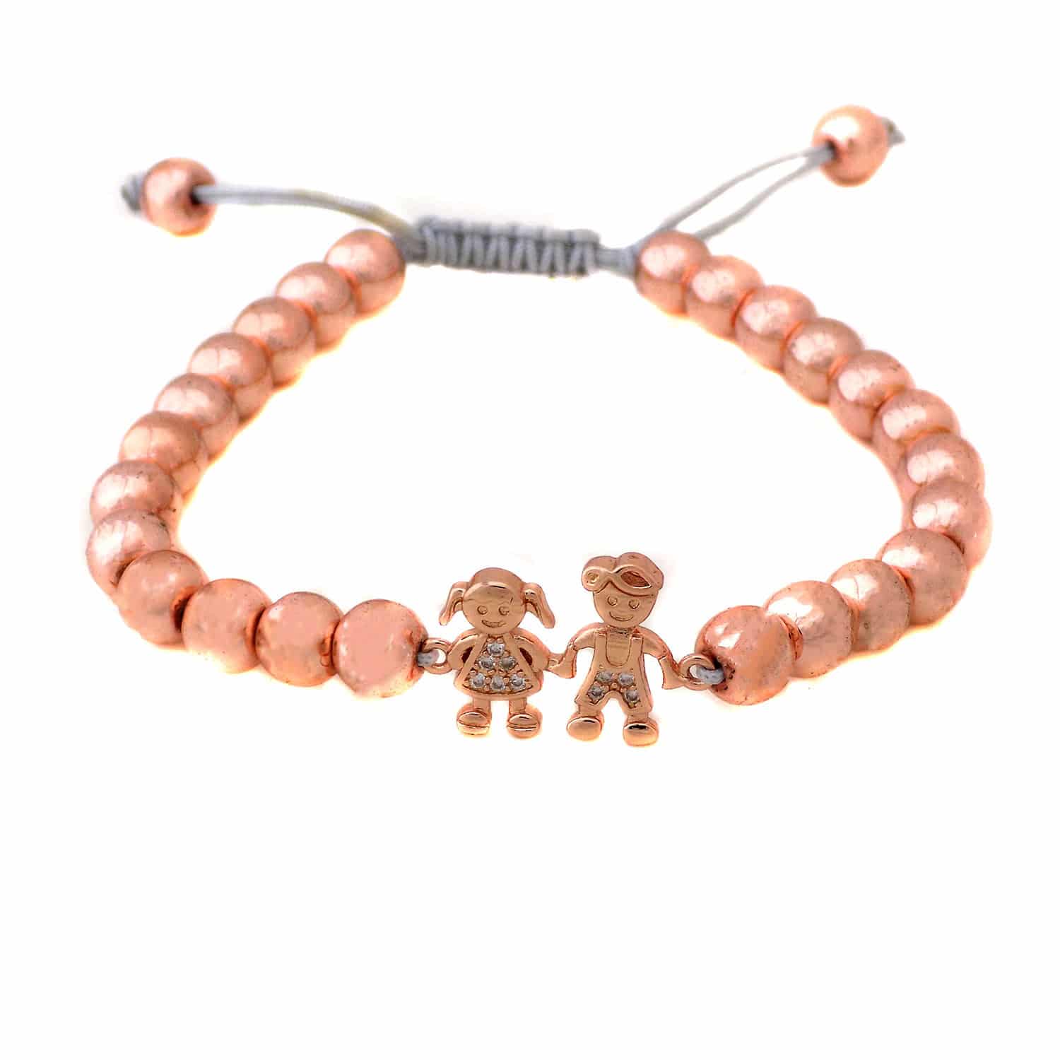 دستبند بچگانه سنگ حدید رزگلد ds-n865 دارای مهره استیل می باشد که به صورت کودک دختر و پسر می باشد که دارای آبکاری رزگلد هستند و علاوه بر این نگین نیز بر روی انها استفاده شده است که از نوع زیرکونیا می باشند. این دستبند شیک و زیبا دارای قفل کراواتی است که از طریق آن می توان دستبند را تغییر سایز داد.