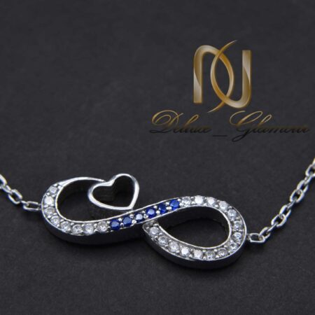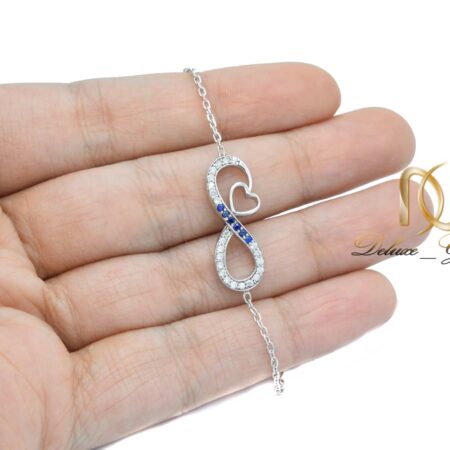 دستبند دخترانه نقره طرح بی نهایت ds-n533 از سری طرح های بی نهایت می باشد که تلفیقی از قلب و علامت بی نهایت می باشد که طرحی برگرفته شده از سمبل های دوست داشتن می باشد. این دستبند دخترانه ظریف از جنس نقره عیار 925 ساخته شده و از روکش آب طلای سفید بر روی آن استفاده شده تا همرنگ طلا سفید باشد. این دستبند دخترانه شیک نگین کاری شده است و بر روی علامت بی نهایت از نگین های سرمه ای و سفید رنگ استفاده شده است که از نوع برلیان اتمی می باشد.