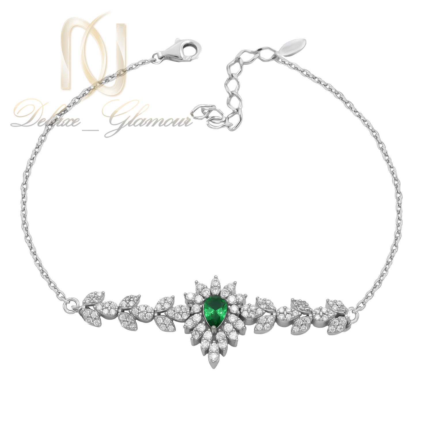 دستبند نقره زنانه جواهری نگین سبز به صورت زنجیری تک ردیفه ساخته شده است که نوع بند و زنجیر از طرح فلامینگو می باش که مهره های وسط دستبند نیز به صورت طرح برگ با نگین کاری و مخراج کاری ماشینی هستند که جنس نگین های سفید و ریز از نوع زیرکونیای اتمی می باشد و نگین وسطی طرح اشک از نوع زیرکونیا تراش خورده است.