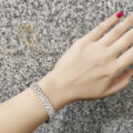 دستبند نقره زنانه طرح V نگین دار پهن به صورت پرنگین ساخته شده به صورت رویه آن کاملا از نگین پوشانیده شده که از جنس زیرکونیای اتمی هستند و با مخراج کاری ماشینی و سنگفرشی به کار رفته اند که باعث شده بدون ریزش باشند. این نکته را نیز باید اضافه کنیم که جنس نگین های این دستبند همانند نگین هایی است که بر روی طلا مورد استفاده قرار می گیرد و از درخشش بالایی برخوردارند.