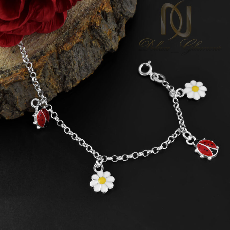 دستبند کودکانه نقره ترک آویزدار ds-n941 دارای آویز های زیبای کفشدوزک و بابونه است که بر روی دستبند برای زیبایی بیشتر به کار رفته اند. این دستبند زیبا دارای طول 15 سانتی متر می باشد که قفل آن نیز به صورت حلقه فنری می باشد. این دستبند زیبا برای هدیه دادن به عزیزان و فرزندان شما نیز گزینه مناسبی است و با توجه به وزن کم آن از قیمت مناسبی برخوردار است.
