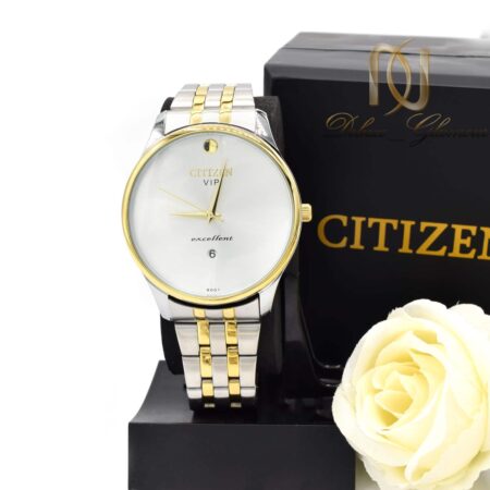 ساعت مچی مردانه citizen استیل به صورت دو رنگ می باشد و در قسمت های طلایی ساعت از روکش آب طلا استفاده شده است. صفحه این ساعت به صورت گرد با پس زمینه سفید می باشد که در آن تاریخ شمار نیز وجود دارد. قفل استفاده شده در این ساعت نیز به صورت دکمه ای – سگکی می باشد که امکان افزایش سایز را برای ساعت امکان پذیر می سازد همچنین از طریق بند ساعت می توان آن را در صورت لزوم کوتاه تر نمود.