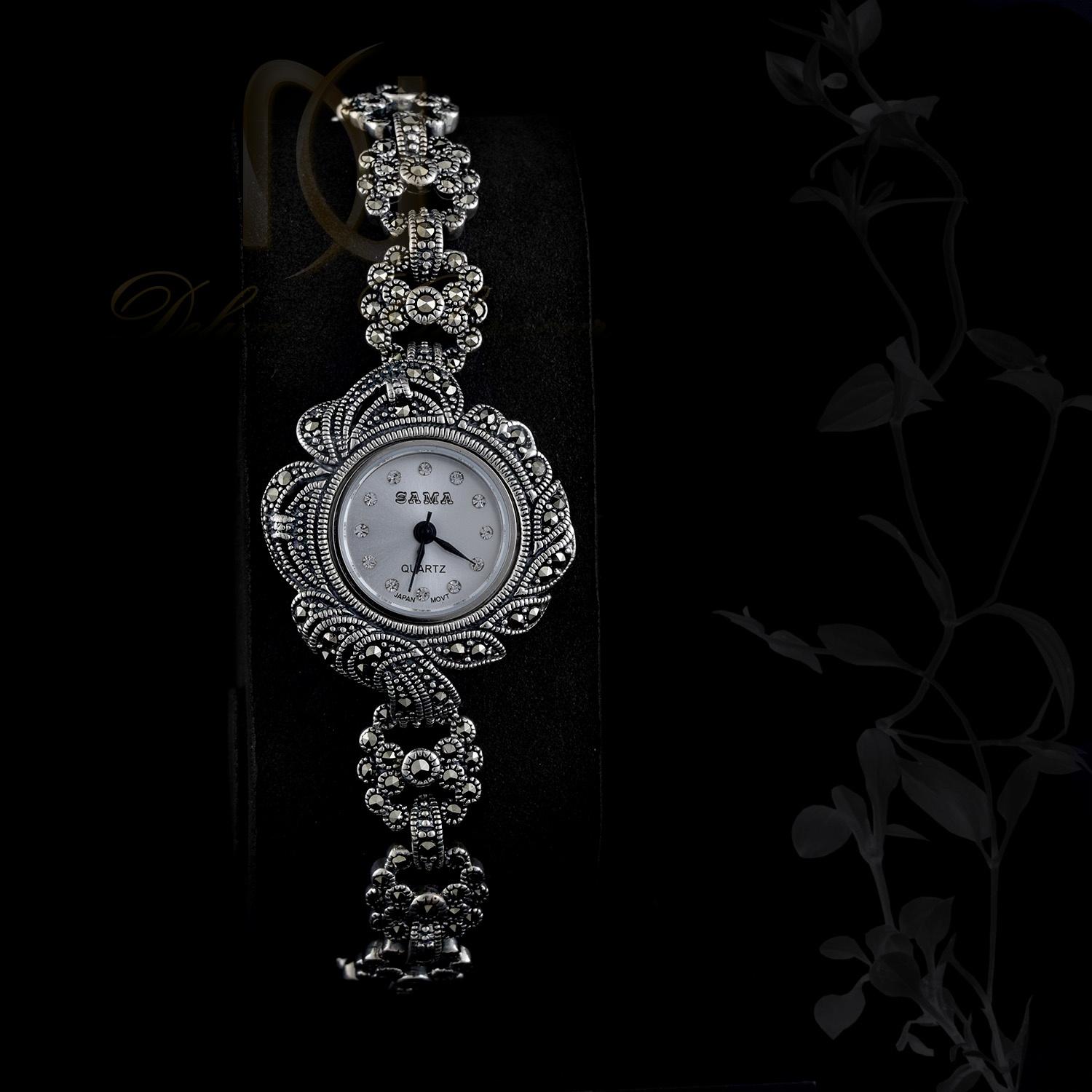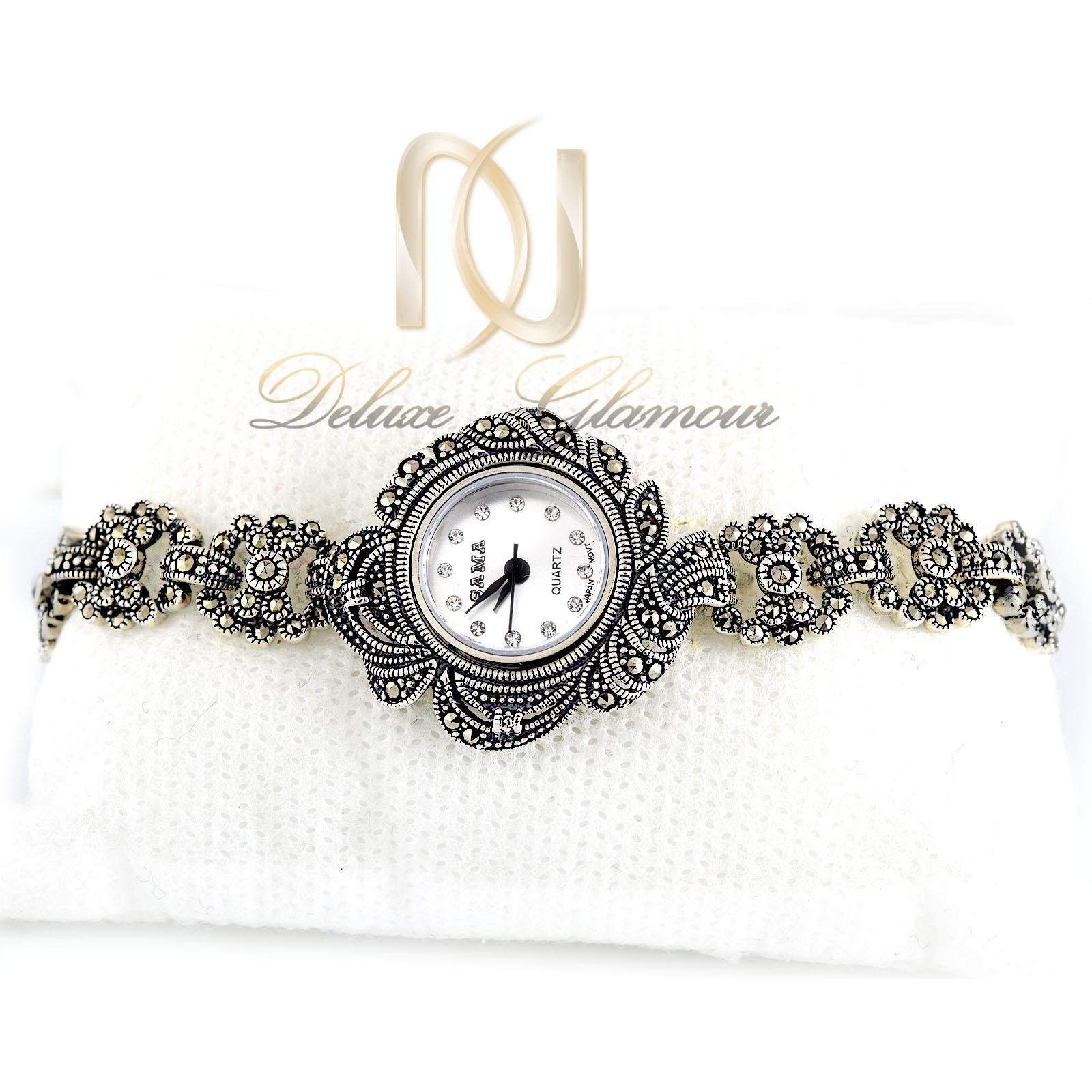 ساعت نقره زنانه سیاه قلم صفحه گرد WH-N108 جزو زیورآلات و اکسسوری های شیک زنانه محسوب می شود که از جنس فلز نقره با عیار 925 می باشد و بدون تغییر رنگ است. این ساعت زیبا دارای طرح سیاه قلم می باشد و بر روی آن نگین های مارکازیت درخشان و شفافی قرار گرفته اند که به صورت باگت و بدون ریزش می باشند.