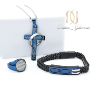ست دستبند، انگشتر و گردنبند مردانه خاص ns-n688 یکی از زیباترین و خاص ترین ست های های مردانه و پسرانه است که دارای استایل اسپرت و تم آبی نفتی میباشد. دستبند این ست زیبا که به صورت طرح رولکس است از استیل درجه یک و با کیفیت ساخته شده است که بندی مشکی با رویه ای آبی نفتی دارد که در وسط دستبند لوگو تجاری رولکس حک شده است. دستبند این ست زیبا دارای طول 20 سانتی متر است و قفل استفاده شده روی آن از نوع آهنربایی می باشد.