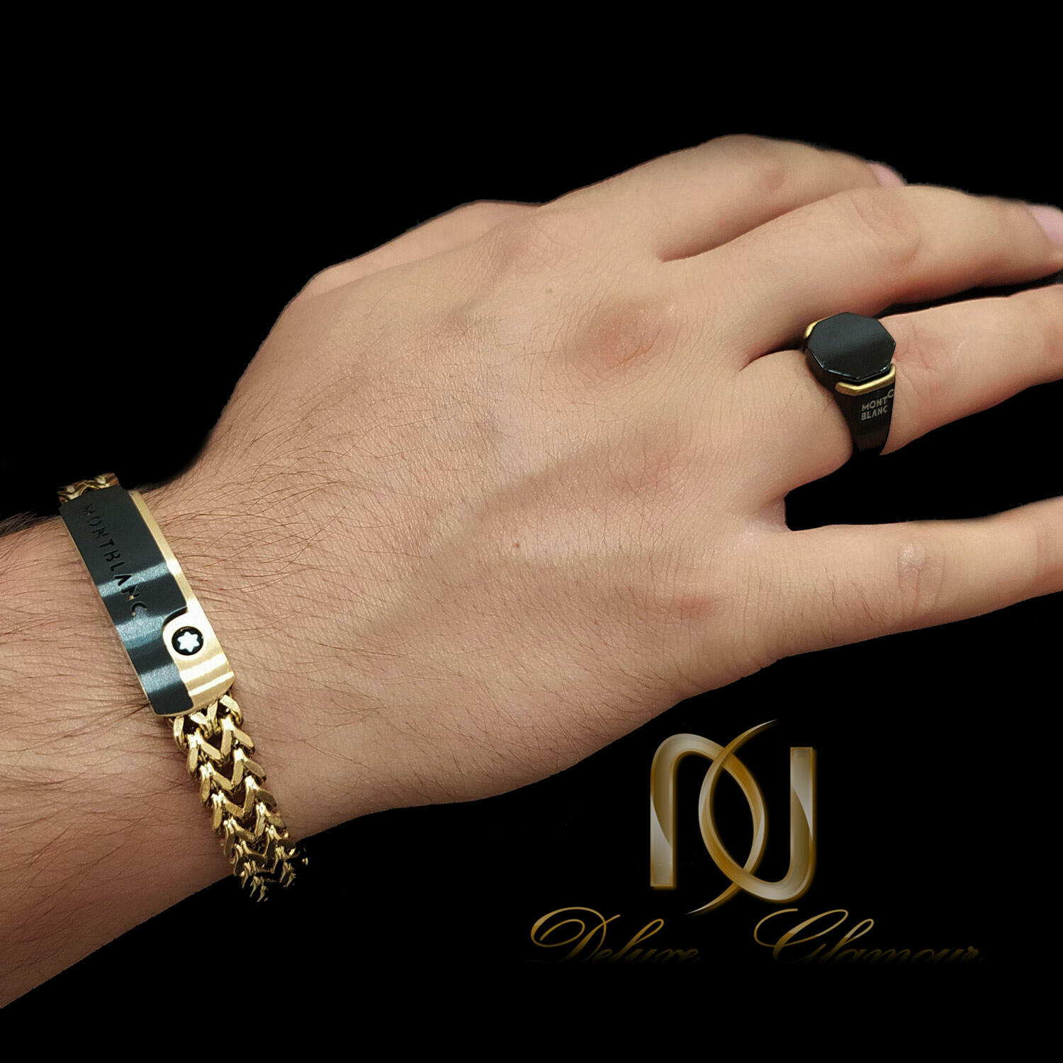 ست دستبند و انگشتر استیل مردانه خاص ns-n999 دارای انگشتری زیبا و شیک است که همانند دستبند به صورت طرح مونت بلانک است که از استیل درجه یک ساخته شده است و ترکیب رنگ های آن طلایی و مشکی است. این انگشتر مردانه زیبا دارای نگین شش ضلعی نیز است که به صورت طرح عقیق می باشد و زیبایی انگشتر را افزایش داده است. انگشتر این ست زیبا دارای سایزبندی های مختلف است از همین رو توصیه می شود قبل از خرید اقدام به تعیین سایز انگشتر نمایید.