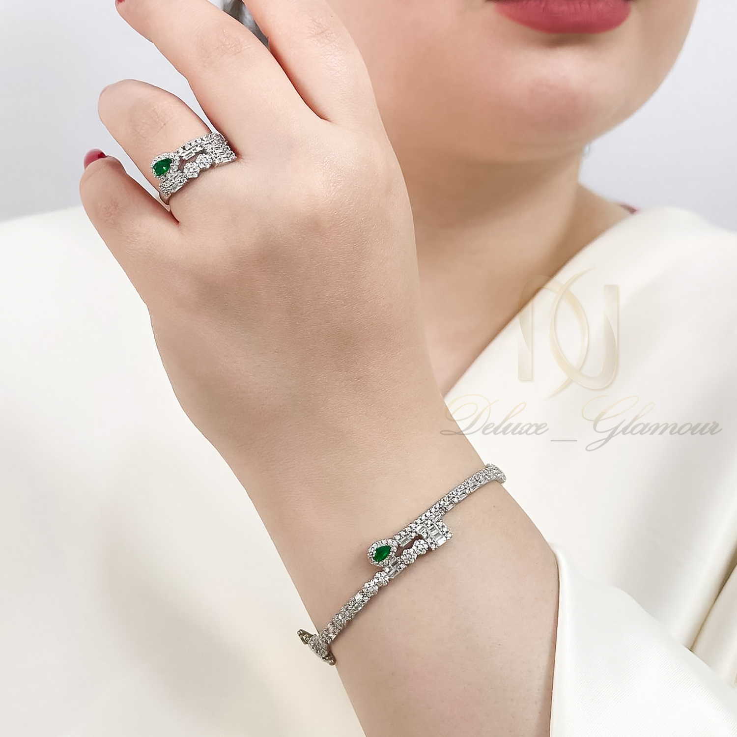 ویژگی های ست دستبند و انگشتر نقره طرح امرالدکات و اشک