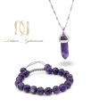 ست دستبند و گردنبند سنگ آمتیست اصل za-n708 از سری زیورآلات دست ساز می باشد که به صورت اسپرت است و برای استفاده بانوان و آقایان مناسب می باشد. این ست زیبا از سنگ آمتیست اصل ساخته شده است که دارای ویژگی های منحصر به فردی می باشد که در مقاله آشنایی با سنگ آمتیست بدان اشاره شده است. دستبند این ست زیبا دارای سنگ های سایز 8 می باشد که در روی نخ با کیفیت و بادوام قرار گرفته شده اند و قفل دستبند به صورت کشویی می باشد که باعث می شود دستبند فری سایز باشد.