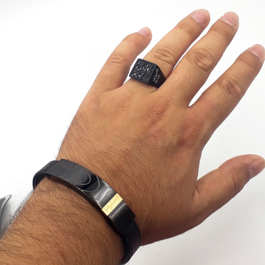 ست مونت بلانک مردانه دست و انگشتر ns-n688 دارای انگشتر زیبای تم مشکی است که به صورت طرح مونت بلانک است و تاج مربعی شطرنجی دارا می باشد. این انگشتر نیز از استیل عیار 316 ساخته شده است که بر روی پوست نیز ایجاد حساسیت و خارش نمی کند و برای استفاده روزانه مناسب می باشد. انگشتر این ست مردانه زیبا نیز دارای سایزبندی های مختلف است از همین رو توصیه می شود قبل از خرید اقدام به تعیین سایز انگشتر نمایید.