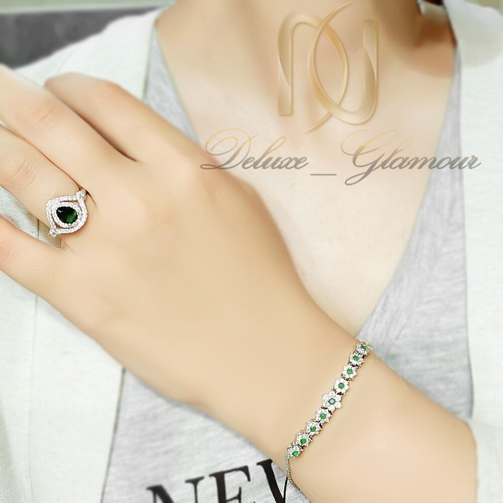 ست نقره دستبند و انگشتر زنانه نگین سبز جواهری ce-n127 یک ست زیبا و درخشان از سری زیورآلات زنانه و دخترانه است که از دستبند و انگشتر تشکیل شده که از نقره عیار 925 ساخته شده است که بر روی آن روکش رودیوم چندلایه قرار گرفته تا کاملا همرنگ طلا سفید شود. از دیگر مزیت های روکش رودیوم نسبت به آبکاری های بی کیفیت نظیر نیکل این است که با پوست های حساس نیز کاملا سازگار و بر روی پوست ایجاد حساسیت نمی کند.