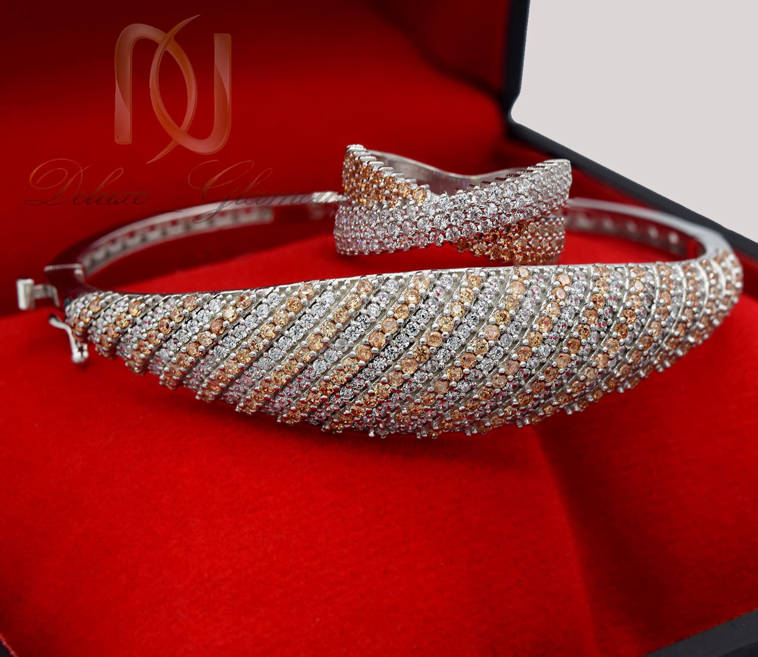 ست نقره زنانه دستبند و انگشتر ns-n697 دارای نگین کاری نیز می باشند به صورتی که ترکیبی از نگین های شامپاینی و سفید هستند که از نوع اتمی می باشند که درخشش بالایی دارند و از سوی دیگر بدون ریزش نیز هستند. دستبند این ست زیبا به صورت النگویی و قفل اهرمی می باشد در سه سایز در فروشگاه لوکس گلامور موجود است از همین رو تعیین سایز دستبند قبل از خرید الزامی می باشد.