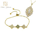 ست نقره طلایی زنانه نگین دار شیک ma-n710 یکی از جذاب ترین گزینه ها برای جایگزین با ست های طلا می باشد و از دستبند و گردنبند تشکیل شده است. برای ساخت این ست زیبا و شیک از نقره عیار 925 درجه یک استفاده شده است که روکش آب طلای 18 عیار باعث شده است تا از لحاظ رنگ و براقیت با نمونه طلا تفاوتی نداشته باشد.