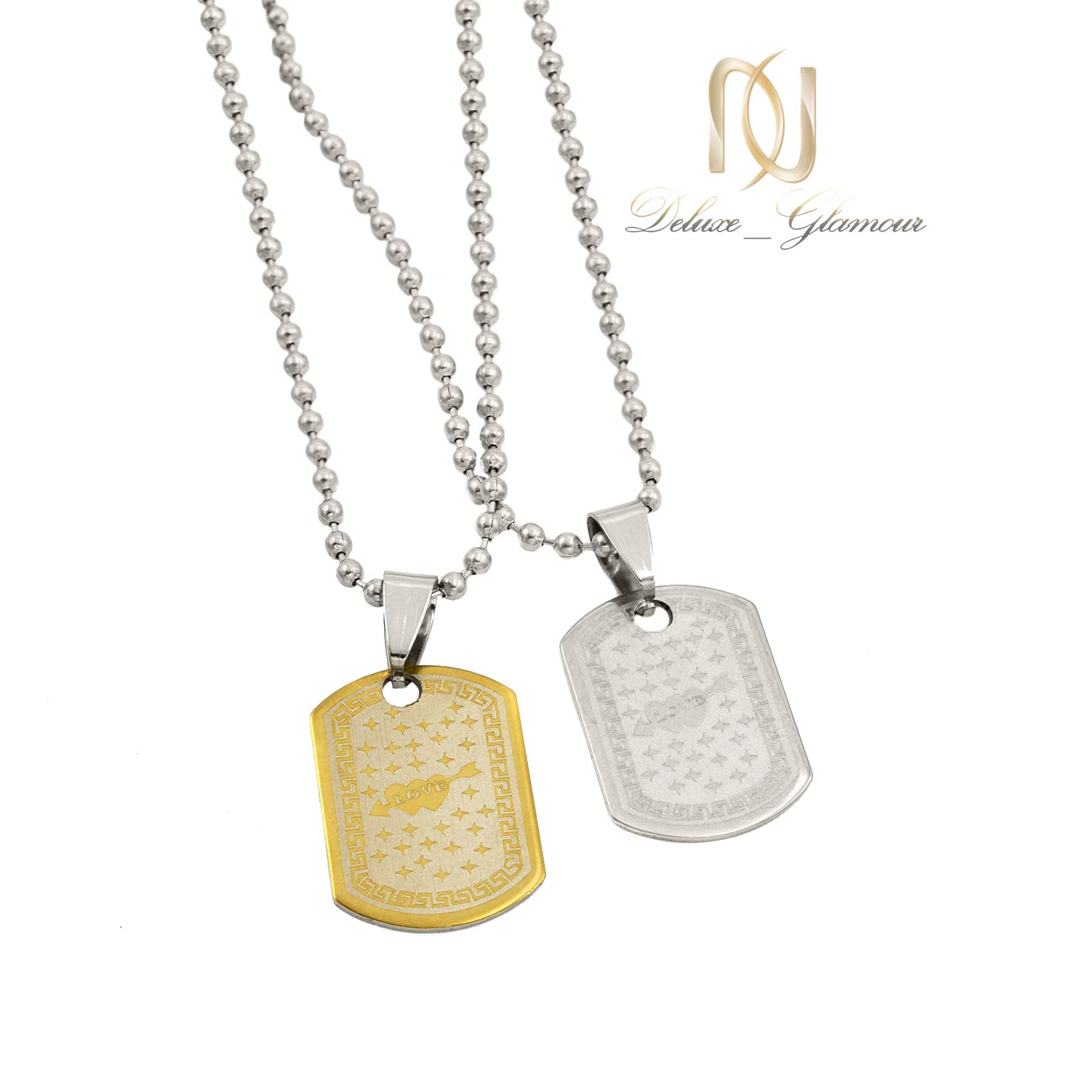 ست گردنبند عاشقانه دوتایی nw-n645 از سری زیورآلات و گردنبند های ست می باشد که از دو گردنبند هم شکل تشکیل شده است. این گردنبند های دو تکه زیبا از جنس فلز استیل می باشند و دارای روکش نیز می باشند و بدون تغییر رنگ نیز می باشند.یکی از این پلاک ها دارای تم طلایی و دیگر دارای تم نقره ای است و بر روی آنها از نماد قلب استفاده شده است که یکی از نماد های دوست داشتن می باشد.