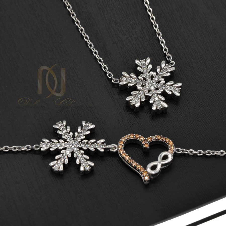 دستبند قرار گرفته شده بر روی ست دستبند و گردنبند دخترانه دارای طولی به اندازه 17 سانتی متر می باشد که در انتهای آن زنجیر اضافی 4 سانتی برای افزایش سایز در نظر گرفته شده است. طرح این دستبند نیز به صورت تلفیقی از برف، قلب و طرح بی نهایت می باشد. البته باید این نکته را یادآوری کنیم که نگین های قرار گرفته شده بر روی مهره های برف به رنگ سفید و نگین های استفاده شده بر روی قلب به رنگ شامپاینی می باشد که همگی از نوع برلیان اتمی هستند. زنجیر قرار گرفته شده بر روی ست دخترانه طرح برف ns-n493 دارای طول 45 سانتی متری با قفل حلقه فنری می باشد.