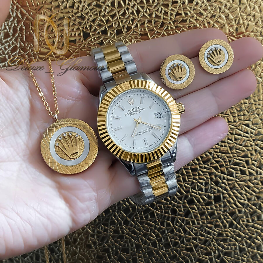 ست گردنبند و گوشواره و ساعت زنانه رولکس ce-n251 از سری اکسسوری های خاص زنانه است که از ترکیب نیم ست زنانه مدل رولکس و ساعت زنانه رولکس ساخته شده است. این ست دارای تم نقره ای و طلایی است که باعث شده تا با انواع لباس ها و اکسسوری های دیگر نظیر انگشتر و دستبند نیز بتوان آن را ست کرد.
