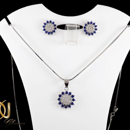 نیم ست دخترانه گوشواره و گردنبند نقره با نگین های آبی زیرکونیا ns-n168 از سری زیورآلات دخترانه است و از فلز نقره ساخته شده و محصول کشور تایلند تایلند می باشد. این نیم ست با عیار 925 دارای کیفیت فوق العاده بالا می باشد. این نیم ست متشکل از گوشواره و گردنبند است و به شکل گل می باشد که بر روی آن نگین های ریز کریستالی سفید و آبی رنگی وجود دارند که از جنس زیرکونیا می باشند و به صورت باگت به کار رفته اند و بدون ریزش می باشند. طول تقریبی پلاک این نیم ست 1 سانتی متر و طول گوشواره ها 5 میلی متر می باشد که باعث شده است این نیم ست جزو نیم ست های دخترانه ظریف باشد.