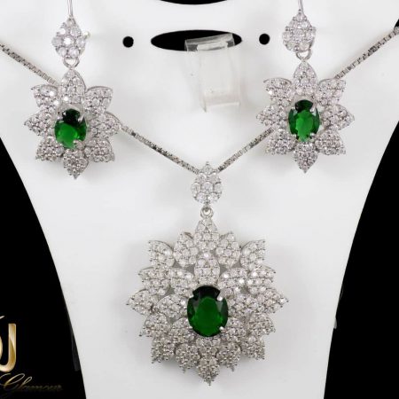 نیم ست زنانه نقره سلطنتی با نگین های کریستالی زیرکونیا ds-n173 از سری زیورآلات زنانه است که از فلز نقره ساخته شده و عیار آن 925 می باشد. این نیم ست ساخت کشور تایلند می باشد واز لحاظ ظاهری طرح سلطنتی را دارا می باشد. این نیم ست متشکل از گوشواره و گردنبند است و به صورت طرح گل است که در وسط آن نگین سبز رنگ و در کناره های آن نگین های کریستالی سفید ر نگی وجود دارند که از جنس زیرکونیا می باشند که درخشش و شفافیت بالایی را دارند.