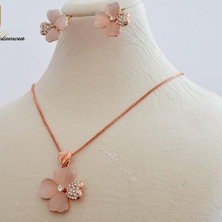 این نیم ست شامل یک گردنبند با پلاک طرح گل چهارپر دارای سنگهای اپال و کریستالهای ظریف سواروفسکی به همراه زنجیر و یک جفت گوشواره روگوشی با قفل گل-میخ (میخی) با طرح گل می باشد و فلز به کار رفته در ساخت آن پالادیوم و بدون نیکل می باشد و در نتیجه ایجاد حساسیت نکرده و مقاوم در برابر تغییر رنگ می باشد. رنگ رز گلد بدنه ی این نیم ست جلوه ای لوکس و منحصر بفرد به آن بخشیده است و آنرا مناسب برای استفاده در انواع مجالس و مهمانی ها کرده است.