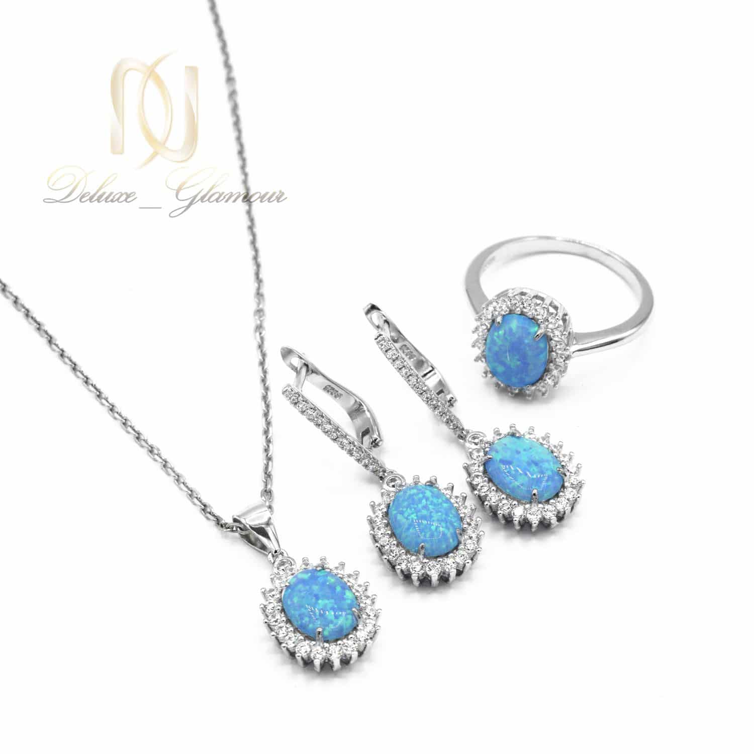 نگین های استفاده شده در نیم ست نقره ns-n484 از نوع سنگ اوپال و برلیان اتمی می باشد به صورتی که نگین های ریز به رنگ سفد کریستالی و از نوع برلیان اتمی می باشد و نگین های آبی از نوع سنگ اوپال می باشد. برای کسب اطلاعات بیشتر نیز می توانید از مقاله آموزش “آشنایی با سنگ اوپال” استفاده کنید. گوشواره های این نیم ست زیبا به صورت آویزی می باشد و قفل گوشواره ها به صورت امگا می باشد. زنجیر قرار گرفته شده بر روی نیم ست نیز دارای طول 45 سانتی متری با قفل حلقه فنری می باشد.