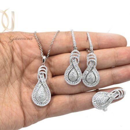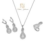 نیم ست نقره پرنگین زنانه ns-n496 از سری ست های زنانه می باشد که به صورت جواهری ساخته شده است. این نیم ست زنانه زیبا از گردنبند، انگشتر و گوشواره تشکیل شده است و از نقره عیار 925 می باشد که در آبکاری آن از آب طلای سفید و رودیوم استفاده شده است. رودیوم استفاده شده در این نیم ست باعث می شود تا نیم ست بر روی پوست ایجاد خارش و حساسیت نکند و از سوی دیگر رنگ و درخشندگی طلا سفید را داشته باشد.
