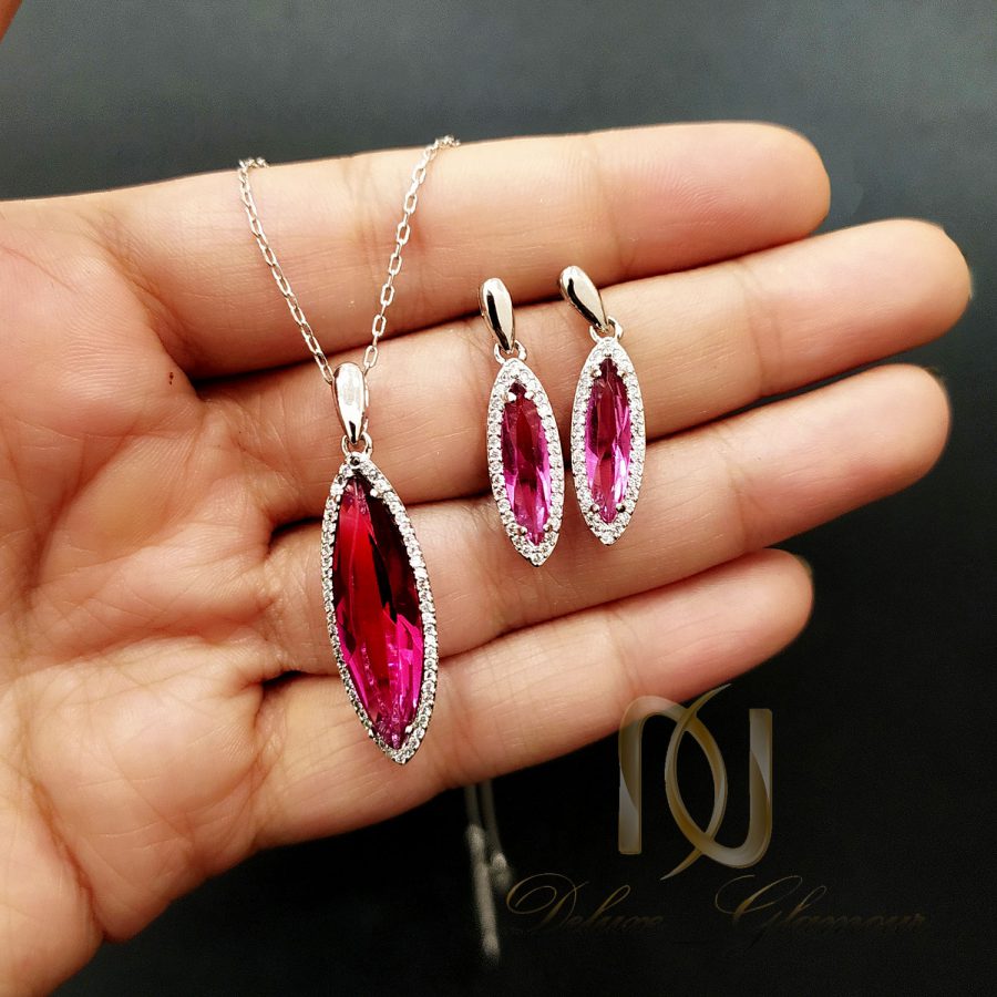 در مرکز گردنبند، کریستال سواروسکی به رنگ قرمز اناری قرار دارد که اطراف آن با نگین های تراش خورده ی ریز تزئین شده است. تمام کریستالها و نگین های به کار رفته در ساخت این گردنبند سواروسکی اصل می باشند که کیفیت و درخشش آنها بر کسی پوشیده نیست.