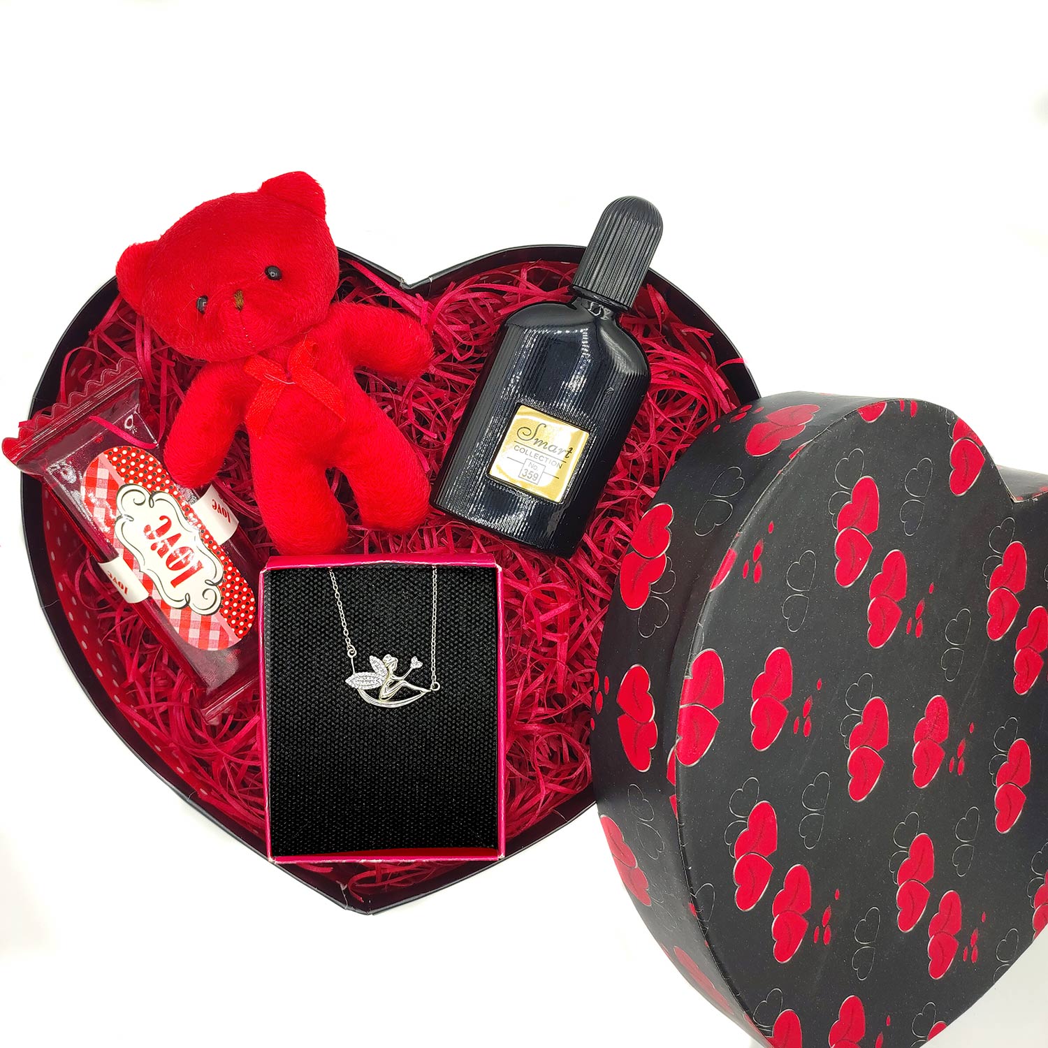 پک کادویی زنانه ادکلن و گردنبند نقره دارای گردنبندی از جنس نقره دارای روکش رودیوم است و از این رو بدون حساسیت بوده و با اطمینان خاطر میتوانید از آن استفاده کنید.در ادامه این پک شامل ادکلن زنانه با نام اسمارت کالکشن 359 میباشد که دارای طبع گرم و شیرین و رایحه ای خوشبو و دخترانه است و جزو ادکلن های زنانه با ماندگاری بالا میباشد.از دیگر مواردی که در این پک کادویی دخترانه قرار داده شده است عروسک خرسی با کیفیت با رنگ قرمز و اسمارتیز میباشد.شما میتوانید این پک دخترانه شیک را بعنوان پک یلدایی و یا بعنوان پک کادویی ولنتاین انتخاب نمایید.