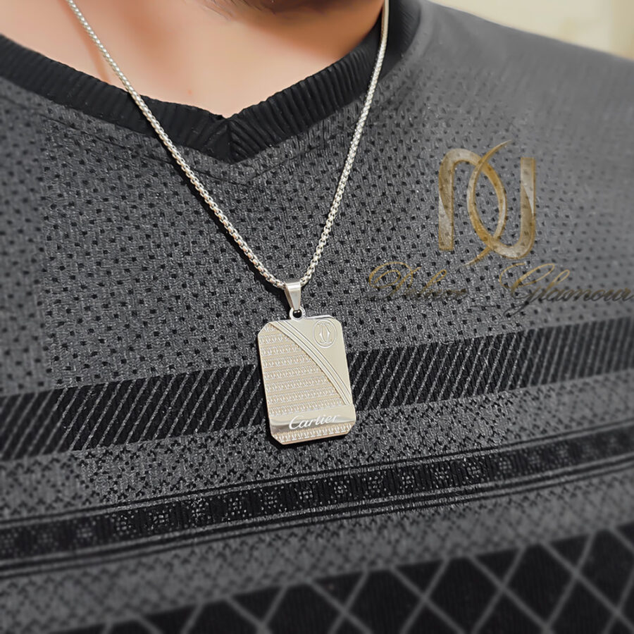 گردنبند مردانه استیل کارتیر دارای پلاکی مستطیلی با طول 4 سانتی متر می باشد که روی آن به صورت برجسته کنده کاری شده است. بر روی این گردنبند مردانه نام و لوگو کارتیر نیز نقش بسته است که سبب زیبایی این گردنبند شده است. علاوه بر پلاک استیل از زنجیر با کیفیت و درجه یک استیل بر روی گردنبند استفاده شده است که طولی برابر با 60 سانتی متر دارد و از نوع زنجیر های پاپ کورن می باشد.